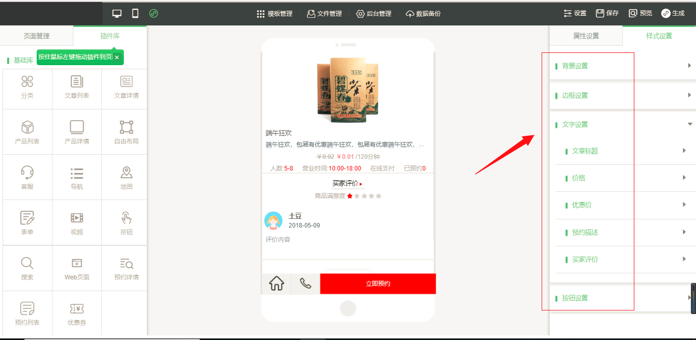 8.在小程序编辑器中拖入“预约列表”插件,会显示除在后台添加的预约产品列表,在属性设置中我们可以进行一些“排序设置”、“显示设置”和“搜索栏设置”等,在“样式设置”中同样也有一些设置项,比如“文字设置”就可以改变页面中的文字颜色,字体等内容,(注意的是要将该列表链接至含有“预约详情”的页面),如图所示: