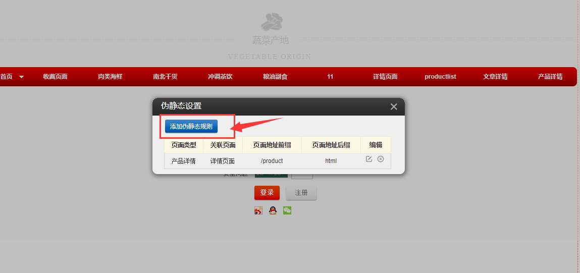 1.以PC版为例,首先在建站编辑器中点击“设置”-“伪静态”-“添加伪静态规则”,选择页面的类型“产品列表”或“文章列表”,进行伪静态的设置,设置完成后点击“保存”,然后在编辑器中拖入“文章分类”或“产品分类”,点击“设置”,将分类链接页面与在伪静态设置中的页面选择一致即可,然后点击保存,如图所示: