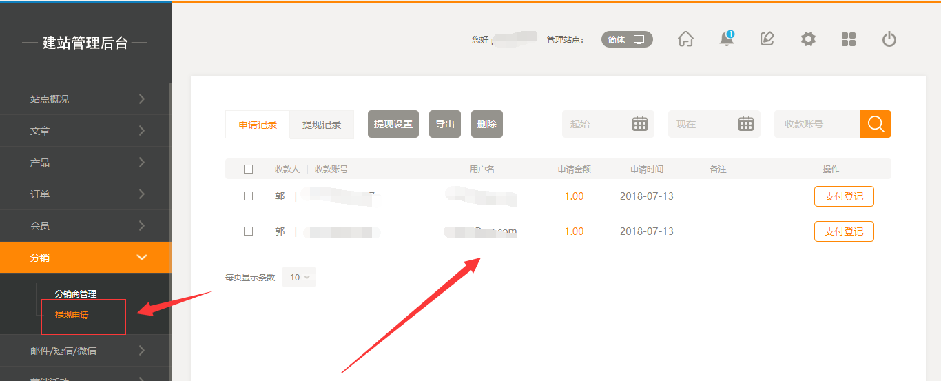 6.当用户在前台提交提现时,在后台的“提现申请”中可以看见该申请记录,如图所示: